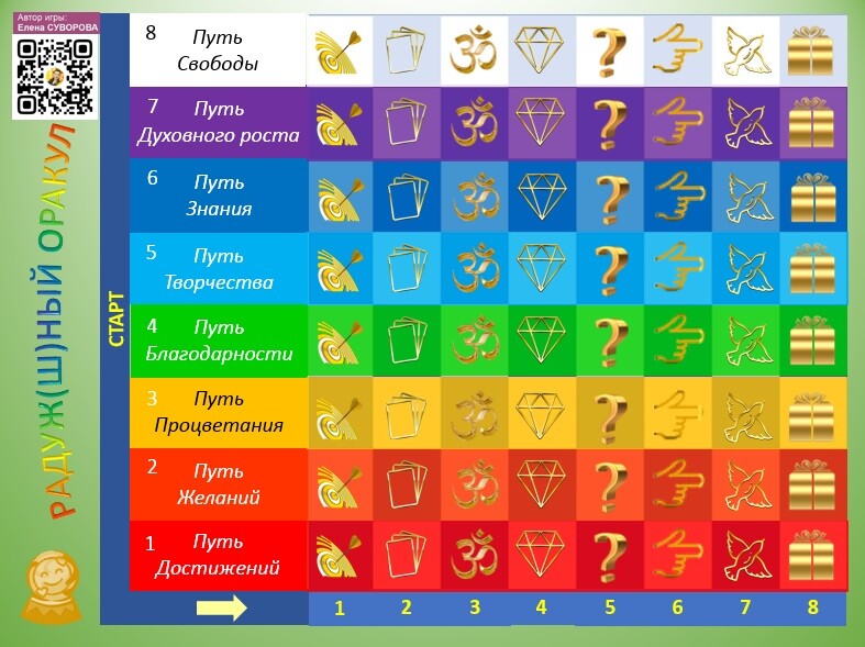 Название пути «подсказывает» участнику, на какую сферу и тему в своей жизни стоит сейчас посмотреть при формировании запроса к «Радуж(ш)ному Оракулу». А выбрать Путь можно самостоятельно, или воспользовавшись кубиком.